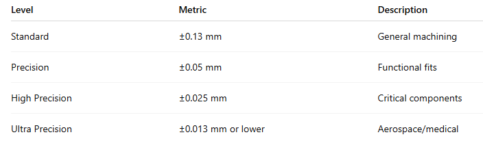 Most CNC machining projects use ±0.127 mm (±0.005″) as a cost-effective standard.