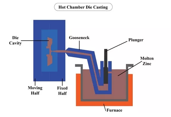 The hot chamber die casting process is ideal for materials with low melting points, such as magnesium alloys, tin, zinc, and lead. This is done to prevent damaging the pump, which could occur when it comes into contact with metals or alloys with a higher melting point. The injection of the melted metal into the die is achieved by applying pressure from a hydraulic system.